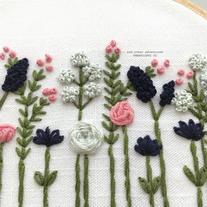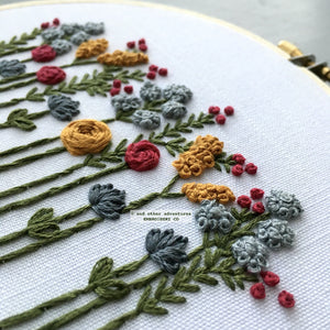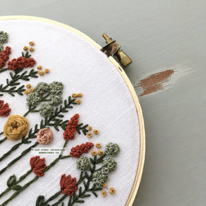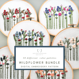 My wildflower embroidery pattern is one of my most popular designs.  And over the years, I have made this design with a lot of different color palettes - 18 to be exact.  This PDF hand embroidery pattern contains ALL 18 COLOR PALETTES.