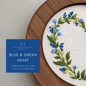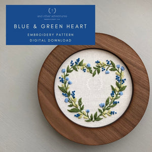 This listing is for 1 digital download of a PDF pattern and stitch guide that teaches you how to make your own blue & green floral heart hoop art. Your purchase includes: