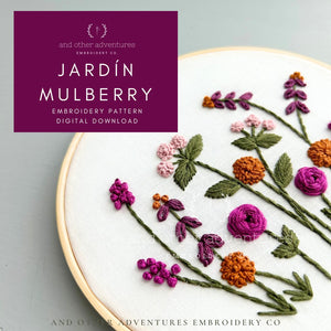 Learn all the beginner embroidery skills with the Jardín Mulberry Embroidery design! This hand embroidery pattern in autumn shades of mustard brown, mulberry and rich green is perfect for beginners looking to add some dimension to their embroidery.