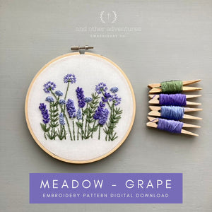 This listing is for the "Meadow in Grape" hand embroidery digital PDF pattern that includes the following: