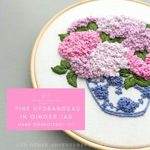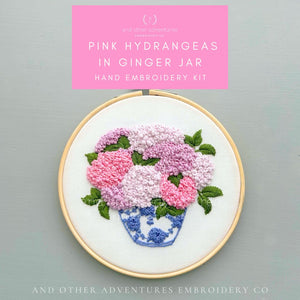 The classic pink hydrangea is timeless and always a crowd favorite. And when you add in the blue ginger jar, this floral design is very much on trend these days. This embroidery kit so much fun and quite calming to do once you learn the stitches... a great way to wind down the day without scrolling on your phone. Plus, you get a beautiful keepsake to hang in room.