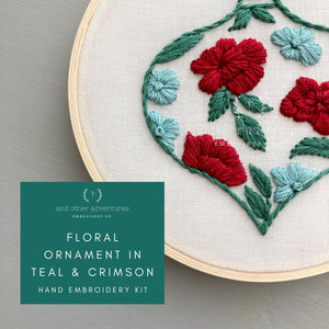 Bring some festive fun to your holidays with this gorgeous hand embroidery kit featuring a floral ornament in teal & crimson. This is a great beginner friendly design to get you in the Christmas spirit. In this kit, I teach many of the foundational stitches that I use across my work.