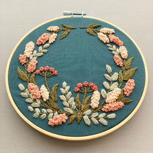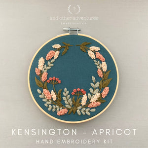 Bring on the flowers! Learn so many foundational hand embroidery stitches while also creating your own gorgeous textured florals in shades of peach, apricot, and olive green. This listing is for the KENSINGTON - Apricot Hand Embroidery KIT that includes the following: