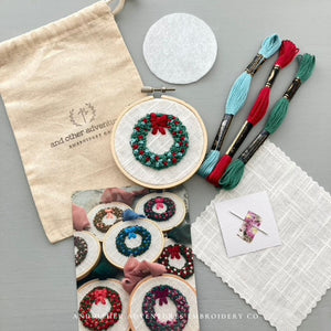 Get ready to make your own Christmas Wreath Ornament!!! Y'all have been asking for a DIY Ornament kit like this for so long and I am thrilled to be able to offer it this holiday season. This mini hand embroidery kit that includes the following: