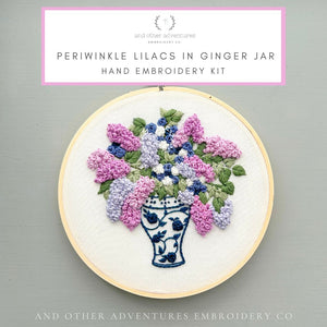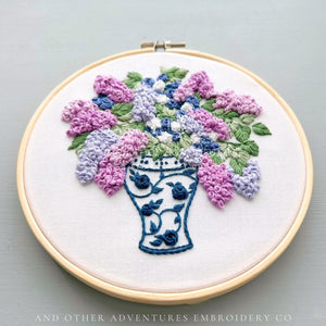 There is nothing quite like the smell of fresh lilacs. And while I can not recreate that dreamy smell with this Periwinkle Lilacs in Ginger Jar hand embroidery kit, I sure can recreate the look of these gorgeous flowers in a classic chinoiserie vase.