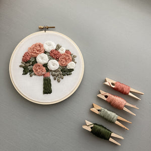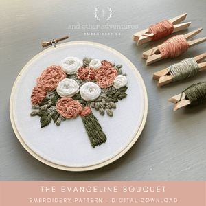 The Evangeline Bouquet is a hand embroidery pattern from The Bloom Collection. I started this collection for all of you who want to create a beautiful bouquet to honor your best friend, your mom, or even to try your hand at recreating your own wedding bouquet. Feel free to use the colors shown here or change it up to embroider the bouquet of your dreams.