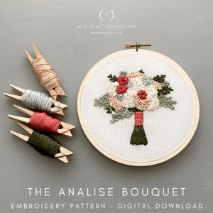 The Analise Bouquet is a hand embroidery pattern from The Bloom Collection, a series of DIY bouquet patterns that each offer a peek into to the life of the woman holding them, a moment captured in time.
