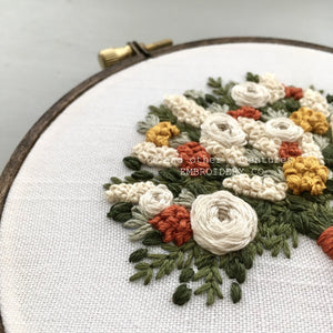 Introducing the Rowan Bouquet. This is an excellent beginner pattern to get you started embroidering all things flowers. With this DIY hand embroidery pattern, you can learn how to create this gorgeous and full embroidered bouquet in autumn shades of rust, ivory, gold and green.