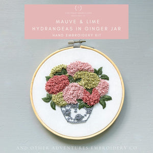 The Mauve & Lime Hydrangeas in Ginger Jar hand embroidery kit includes the following: