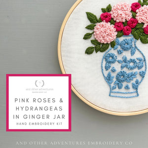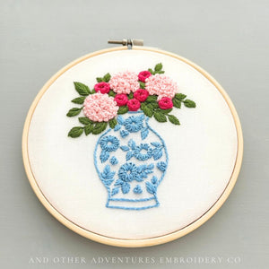 The Pink Roses + Hydrangeas in Ginger Jar hand embroidery kit includes the following: