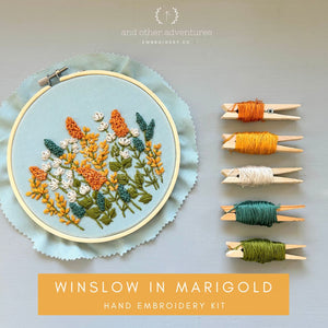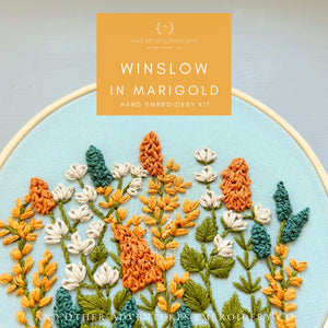 Get ready to stitch some beautiful botanicals with this Winslow in Marigold hand embroidery kit. This stitching project includes the following: