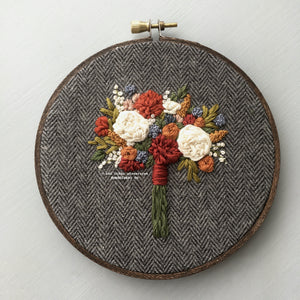 This original embroidery features the perfect Thanksgiving color palette with hand embroidered florals in shades of copper, mustard, olive green and cream. Each flower is hand stitched freehand on to grey herringbone fabric.