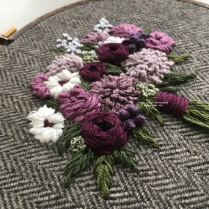 Goodness, how I love a good dark-and-moody floral bouquet!  I am forever inspired by them. And now, with this DIY floral hand embroidery pattern, you can learn how to create your own gorgeous floral bouquet full of rich shades of plums, mauves and greens with loads of texture.