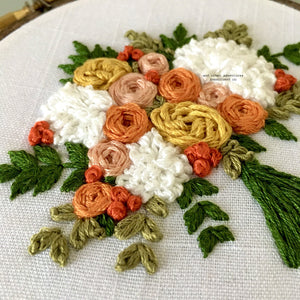 The Savannah Bouquet is the a perfect mix of orange, golden yellow, white and rich greens. And now it is available as a FULL KIT, perfect for the embroidery enthusiast that wants to learn how to create loads of texture.