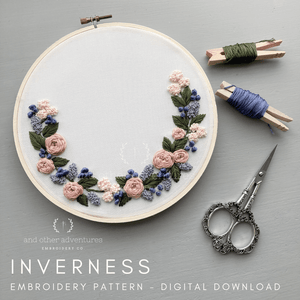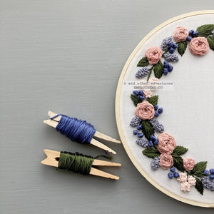 A floral wreath design inspired by the soft spring colors of lilac and dusty rose. Leave the center blank to show off the wreath design or add in some handstitched words that mean something special to you.