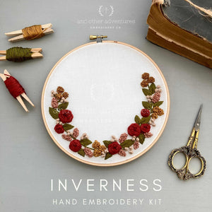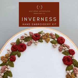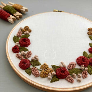 This Copper Inverness design makes me think of beautiful fall leaves, the smell of wood smoke, and a crisp chill in the air. I love fall so much; so of course I created this floral wreath with all those favorite autumn colors in mind and loads of texture. This Beginner embroidery kit includes the following: