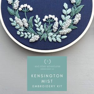 Bring on the flowers! Learn so many foundational hand embroidery stitches while also creating your own gorgeous textured florals. This listing is for the KENSINGTON - Mist Hand Embroidery KIT that includes the following: