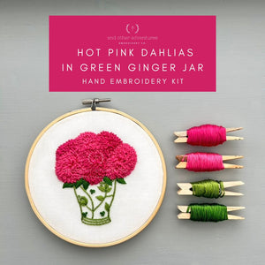 The bright pink and green color palette is a preppy and modern take on the classic chinoiserie aesthetic. The Hot Pink Dahlias in Green Ginger Jar hand embroidery kit includes the following: