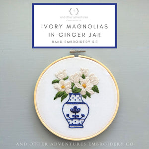 The Ivory Magnolias in Ginger Jar hand embroidery kit includes the following: