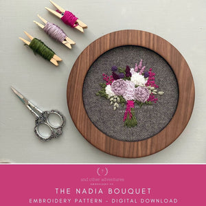 The Nadia Bouquet is a hand embroidery pattern from The Bloom Collection. I started this collection for all of you who want to create a beautiful bouquet to honor your best friend, mom, or sister - maybe even to recreate your own beautiful wedding bouquet. Feel free to use the colors shown here or change it up to embroider the bouquet of your dreams.