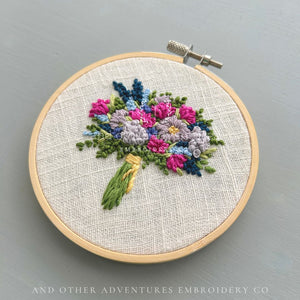 This bouquet is both elegant and whimsical with its various shades of fuchsia, navy blue, sky blue and muted mauve. But those tiny pops of sunshine yellow are what I think pulls it all together. I had so much fun experimenting with color and stitching up these bright florals.