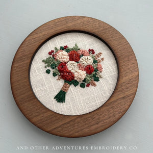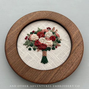 This hand embroidered bouquet is the epitome of autumn with its delicate mix of russet, cinnamon, russet and ivory hues with rich green leaves. It is sophisticated and yet still has an old world feel to it.