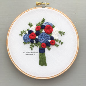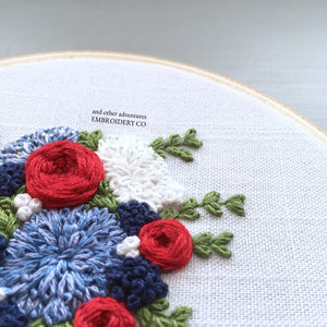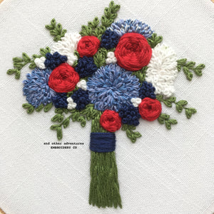 The "Americana" bouquet is all about the red, white, and blue. This latest addition to The Bloom Collection hand embroidery patterns, the Americana Bouquet serves as a patriotic tribute to the good ol' USA and all of those that have served our country.