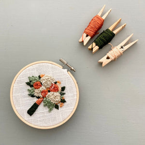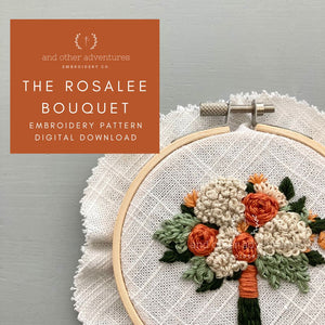 Introducing the Rosalee Bouquet. This fall bouquet embroidery pattern will help you learn how to embroider highly textured florals. With this DIY hand embroidery pattern, you can learn how to create this gorgeous and full embroidered bouquet in shades of burnt orange, ecru, sage and dark hunter green.