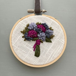 This 3-inch embroidery hoop art features hand embroidered dark magenta, dark periwinkle, and steel blue flowers with dark green leaves tied all together. This bouquet gives off all the rich, wintery vibes. I never make the same bouquet twice - so this is truly one-of-a-kind!