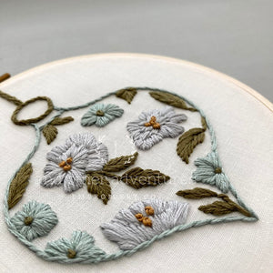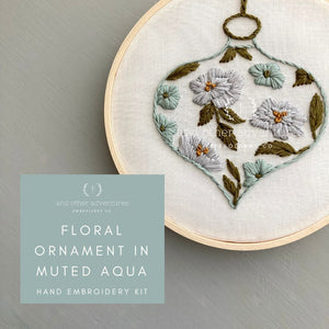 Bring some serenity to your holidays with this gorgeous hand embroidery kit featuring a floral ornament in the calming colors of muted aqua, silvery blue and olive green that make me think of a winter wonderland . This is a great beginner friendly design to usher in the winter season. In this kit, I teach many of the foundational stitches that I use across my work.