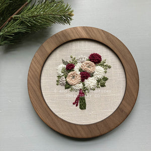 This original embroidered art features hand embroidered rich holiday floral bouquet with loads of texture. Each flower was hand-stitched on to ecru linen and set in a stained frame.