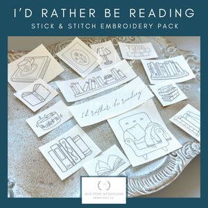 Stick & Stitch Designs are so much fun to use for stitching on jeans, shirts, hat, totes, tea towels, shoes... the list goes on and on! So of course, I had to create some that are all about my 2nd favorite hobby (embroidery is 1st!). I know there are so many of you fellow bibliophiles out there - so I hope you love these as much as I do.