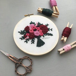 The Valentina Bouquet is the a perfect mix of deep wine, hot pink, and dark green florals. And now it is available as a FULL KIT, perfect for the embroidery enthusiast.