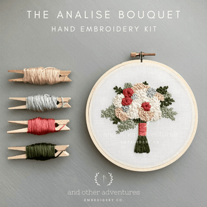 The Analise Bouquet is inspired by the hint of spring - a neutral color palette with a pop of bright color. Available as a FULL KIT, perfect for the embroidery beginner or enthusiast that wants to learn how to create subtle texture.
