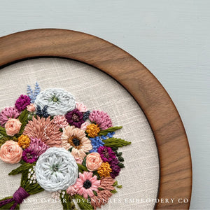 Hand embroidered by Colleen, this one-of-a-kind masterpiece showcases a delicate mix of all different times of flowers. Full of color and texture, this intricate bouquet design is elegant and bold all at the same time.