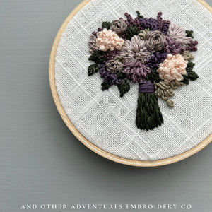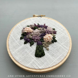 Add a touch of moody elegance with this hand embroidered bouquet art. Featuring plum and smokey purple and ivory florals, this embroidered art is a one-of-a-kind creation.