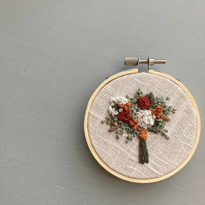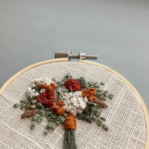 Inspired by the rich colors of fall pumpkin spice, this one of a kind 3-inch embroidery hoop art features hand embroidered pumpkin, copper and ivory flowers with green leaves tied all together.
