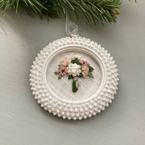 Add a touch of embroidery to your holiday decor this year with an original hand embroidered artwork ornament! This Floral Bouquet Glitter Ornament was hand stitched and is a completely original piece, never to be made again.