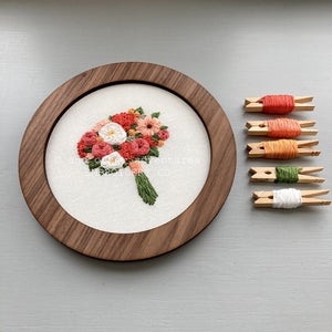 Intense with color, this hand embroidered bouquet is elegantly romantic. Its fluffy white blooms nestle in on shades of textured coral and green, it makes me think of the sunsets, warm breezes, and an conversation-rich evenings on the porch.