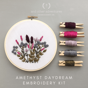 This Amethyst Daydream Embroidery Kit is a great beginner project to cozy up on the couch with. As a Beginner Hand Embroidery Kit, this will teach you the foundational stitches that I use everyday.