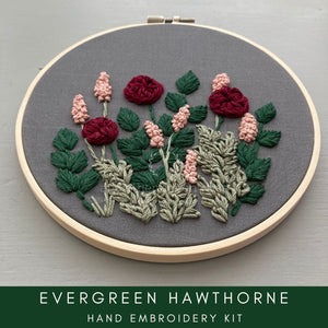This listing is for the HAWTHORNE hand embroidery kit in the Evergreen Color Palette that includes the following: