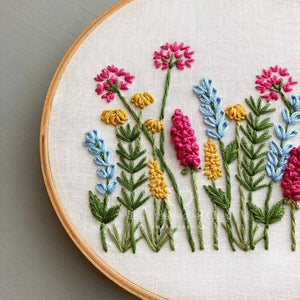 This bright and colorful floral hand embroidery kit is perfect for beginners! In this kit, I teach you 6 of the foundational embroidery stitches that I use across my work. So whether you have never even threading a needle or you are a seasoned embroiderer, this Meadow design will teach you new things that will take you far in your embroidery.
