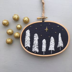 This ready to ship handmade Christmas Hoop Ornament features a hand embroidered forest of trees on a starry night.