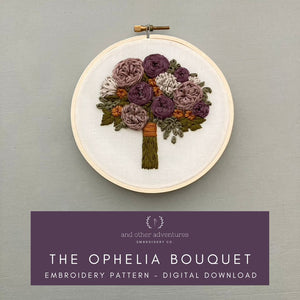 The Ophelia Bouquet is a hand embroidery pattern from The Bloom Collection. I started this collection for all of you who want to create a beautiful bouquet to honor your best friend, mom, or sister - maybe even to recreate your own beautiful wedding bouquet. Feel free to use the colors shown here or change it up to embroider the bouquet of your dreams.