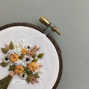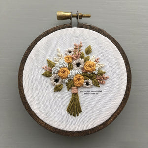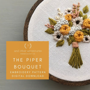 Introducing the Piper Bouquet. This is an excellent beginner pattern to get you started embroidering all things flowers. With this DIY hand embroidery pattern, you can learn how to create this gorgeous and full embroidered bouquet in shades of mauve, ecru, mustard yellow and green.